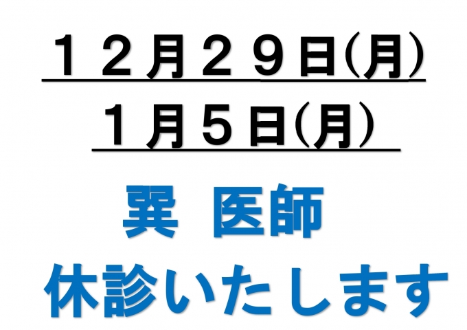 12/29(月)、1/5(月)巽医師休診します。