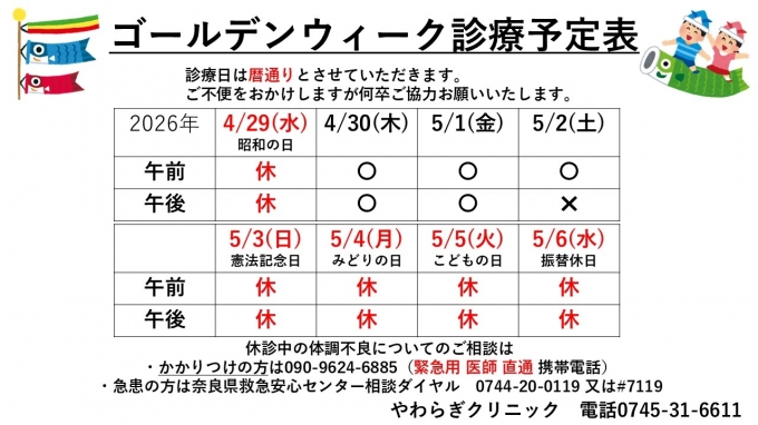 医療法人やわらぎ会TOP > 【ゴールデンウィークの休診日】