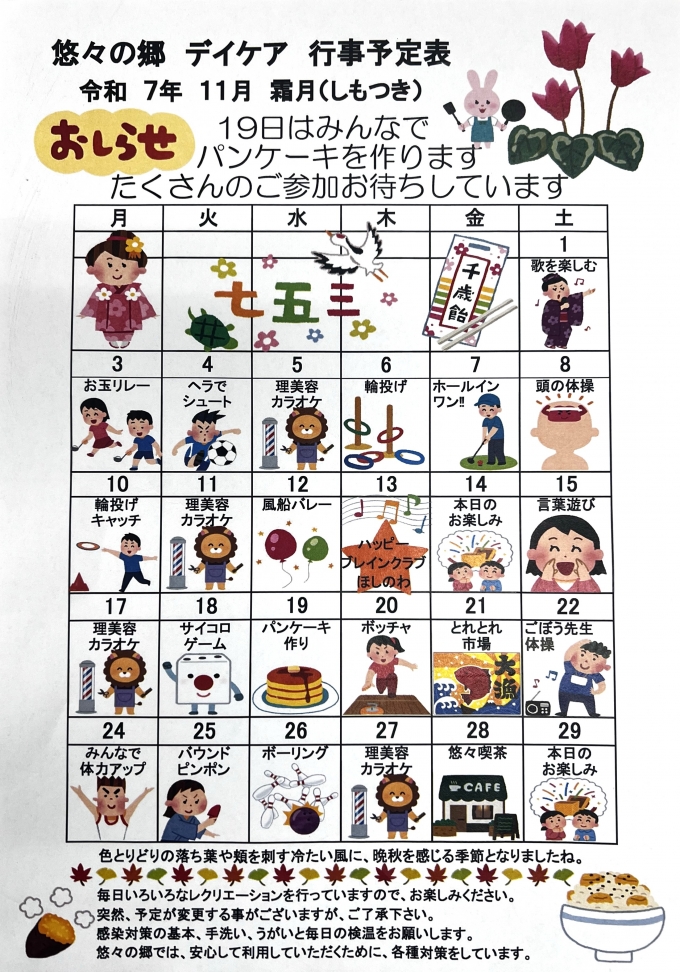 医療法人やわらぎ会TOP > 介護老人保健施設 悠々の郷 > スタッフブログ > 令和7年11月デイケア行事予定
