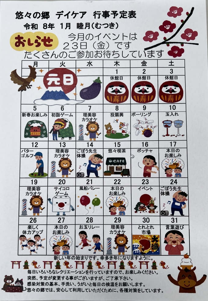 医療法人やわらぎ会TOP > 介護老人保健施設 悠々の郷 > スタッフブログ > 令和8年1月デイケア行事予定