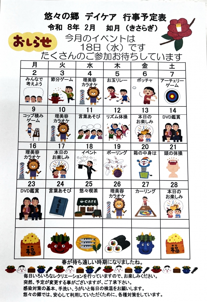 医療法人やわらぎ会TOP > 介護老人保健施設 悠々の郷 > スタッフブログ > 令和8年2月デイケア行事予定